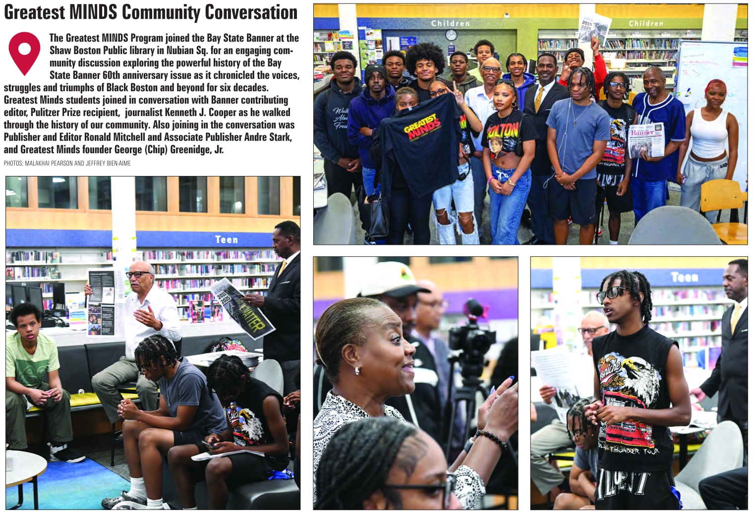 Greatest MINDS Community Conversation The Greatest MINDS Program joined the Bay State Banner at the Shaw Boston Public library in Nubian Sq. for an engaging community discussion exploring the powerful history of the Bay State Banner 60th anniversary issue as it chronicled the voices, struggles and triumphs of Black Boston and beyond for six decades. Greatest Minds students joined in conversation with Banner contributing editor, Pulitzer Prize recipient, journalist Kenneth J. Cooper as he walked through the history of our community. Also joining in the conversation was Publisher and Editor Ronald Mitchell and Associate Publisher Andre Stark, and Greatest Minds founder George (Chip) Greenidge, Jr. PHOTOS: MALAKHAI PEARSON AND JEFFREY BIEN-AIME See also