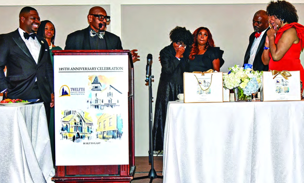 From left: Rev. Dr. Willie Bodrick, II (Senior Pastor), First Lady Dr. Devin Cromarite Bodrick, Rev. Dr. Arthur T. Gerald, Jr. (Senior Pastor Emeritus), First Lady Emeritus Henrietta Gerald, Alana Gerald, Rev. Jeffrey L. Brown (Associate Pastor) and Second Lady Deidre Brown. Rev. Dr. Arthur T. Gerald, Jr. offered heartfelt words of gratitude and love to the Twelfth Baptist congregation as his wife Henrietta tiers up with joy following Pastor Willie Bodrick’s announcement that the TBC Outreach Center would be renamed in his honor.