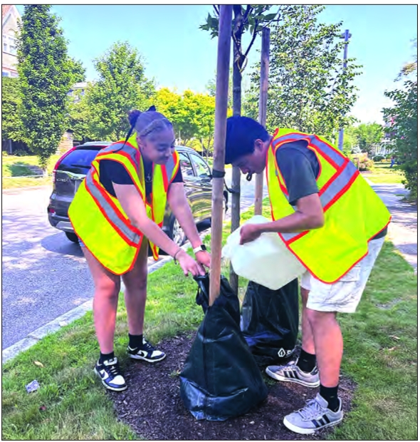 Boston teens water street trees as part of their work with Speak for the Trees’ summer program. Both groups were part of the inaugural cohort of the Boston Youth Climate Corps, a city initiative to employ teens and youth in green summer jobs.