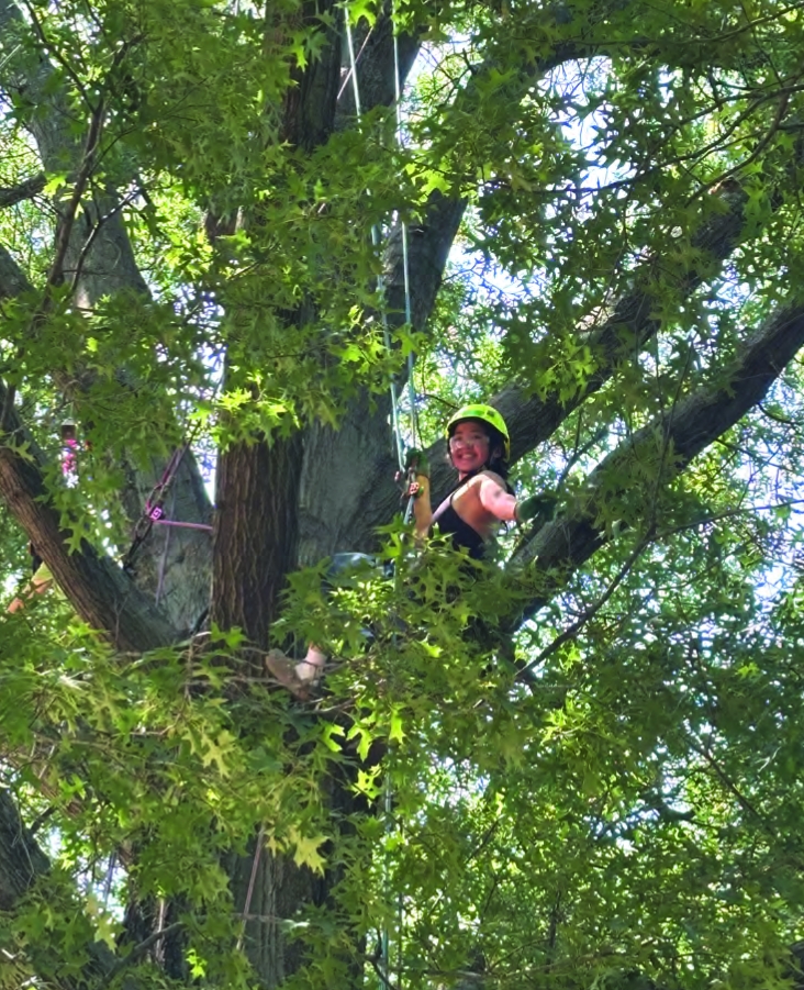 A teen climbs a tree during a Speak for the Trees summer program workshop as part of their work with Boston Youth Climate Corps.