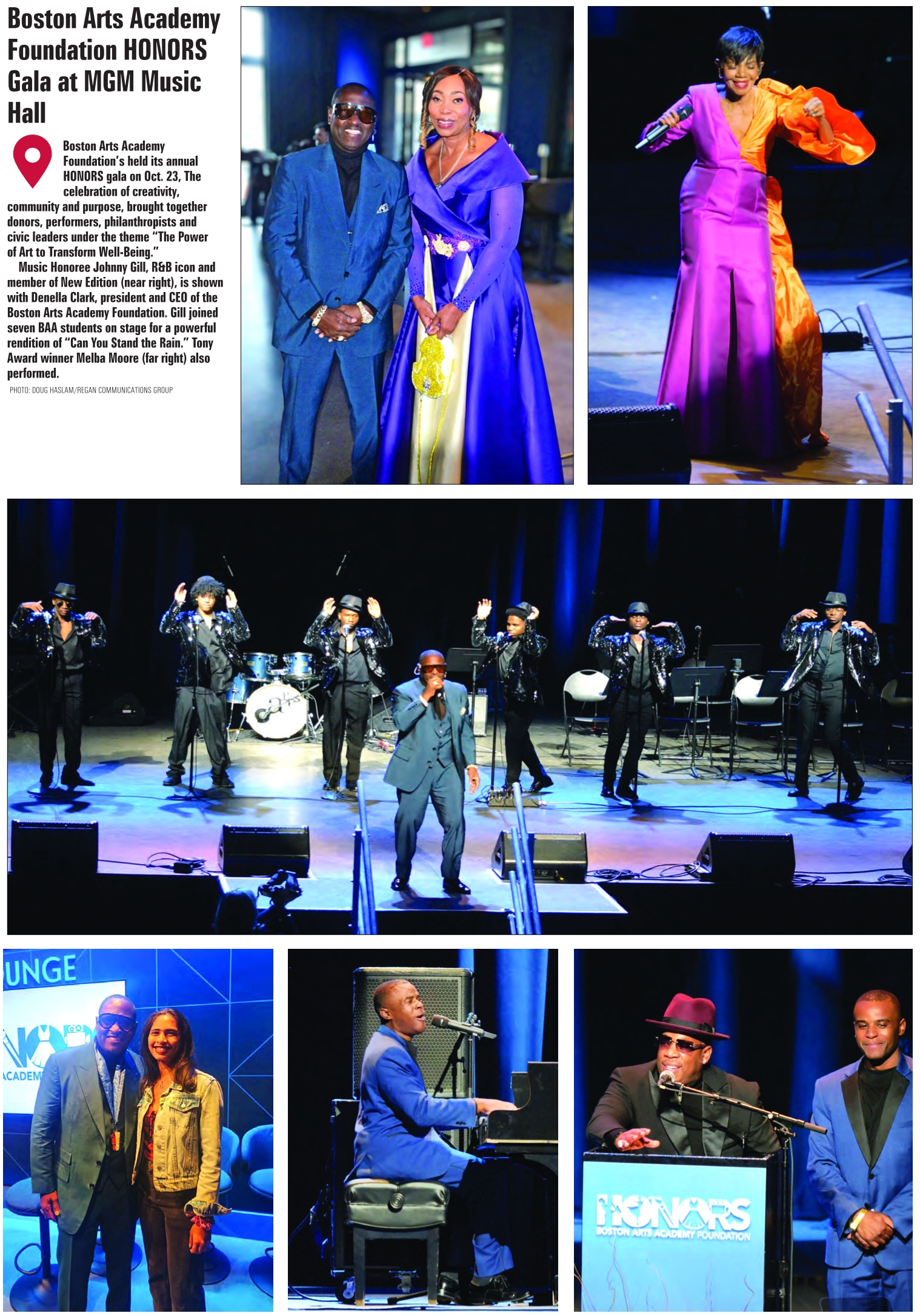 Music Honoree Johnny Gill, R&B icon and member of New Edition (near right), is shown with Denella Clark, president and CEO of the Boston Arts Academy Foundation. Gill joined seven BAA students on stage for a powerful rendition of “Can You Stand the Rain.” Tony Award winner Melba Moore (far right) also performed.