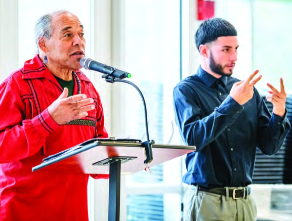 Chief of Mashpee Tribe of Wampanoags Earl Mills Jr., (left), addresses attendees as a translator signs for the hearing impaired.