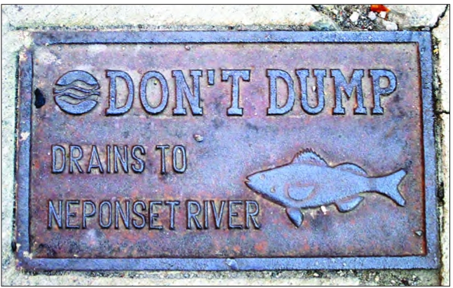 Metal plaques embedded next to storm drains in Boston advise residents not to dump waste into the drains.