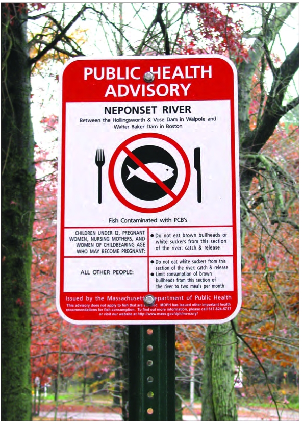 (Above) The Neponset River. The photo was taken during a MassDEP investigation of possible sediment contamination along the river in 2008. (Below) A sign posted along the Neponset River during the same time period.
