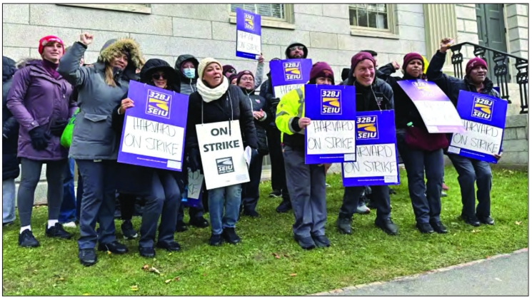 Harvard custodial workers strike in Harvard Yard in Cambridge on Nov. 17.