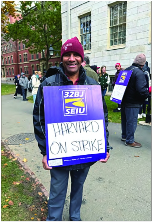 Harvard employee Newton Christian DeJesus on strike in Harvard Yard on Nov. 17.