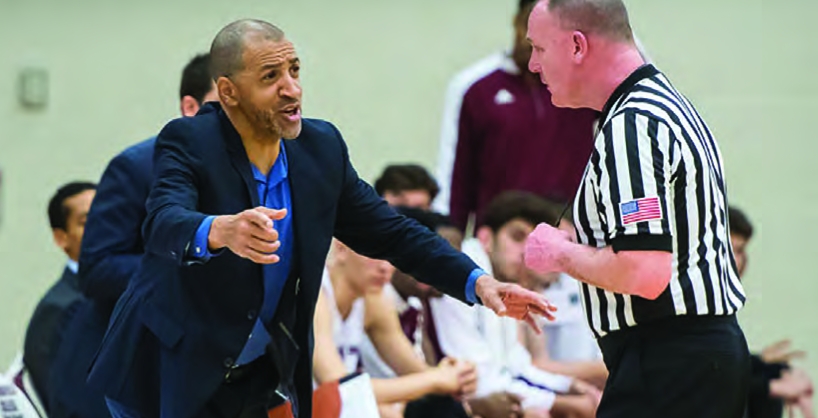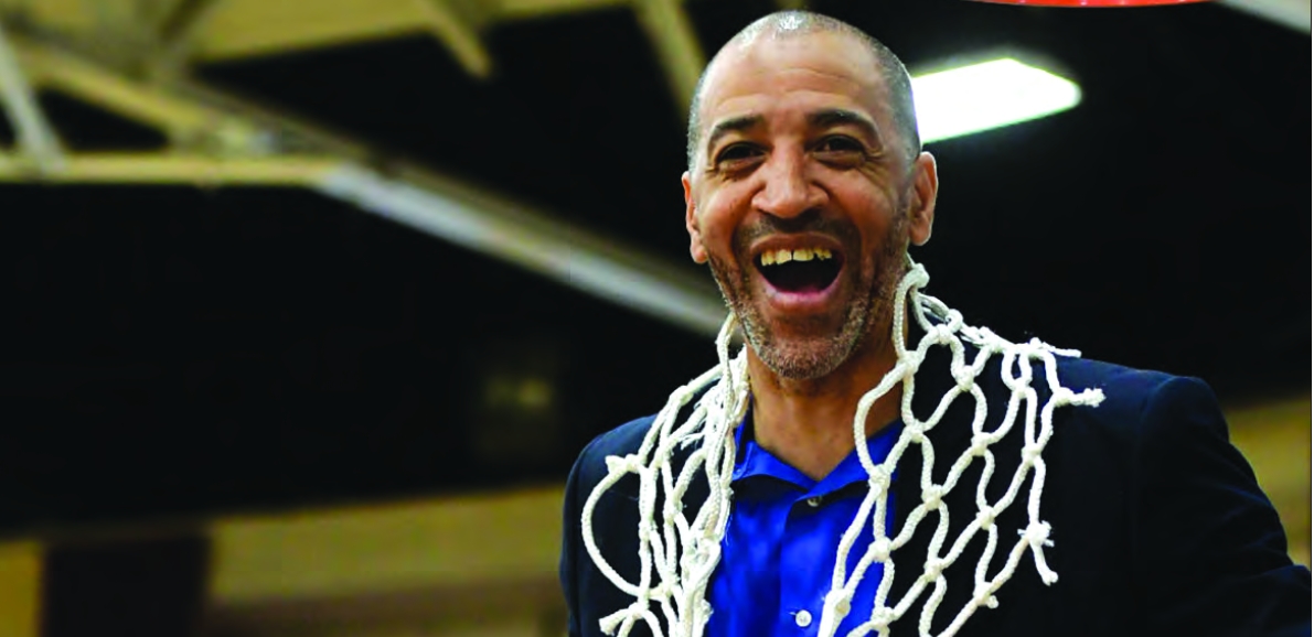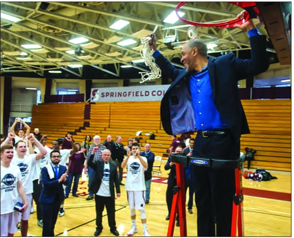 Coach Anderson celebrates the New England and Men’s Athletic Conference (NEWMAC) men’s basketball championship.