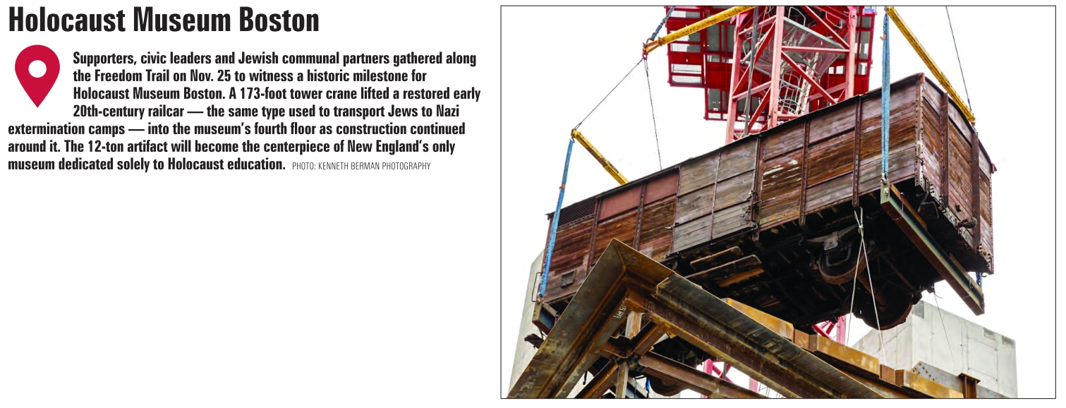 Supporters, civic leaders and Jewish communal partners gathered along the Freedom Trail on Nov. 25 to witness a historic milestone for Holocaust Museum Boston. A 173-foot tower crane lifted a restored early 20th-century railcar — the same type used to transport Jews to Nazi extermination camps — into the museum’s fourth floor as construction continued around it. The 12-ton artifact will become the centerpiece of New England’s only museum dedicated solely to Holocaust education. PHOTO: KENNETH BERMAN PHOTOGRAPHY