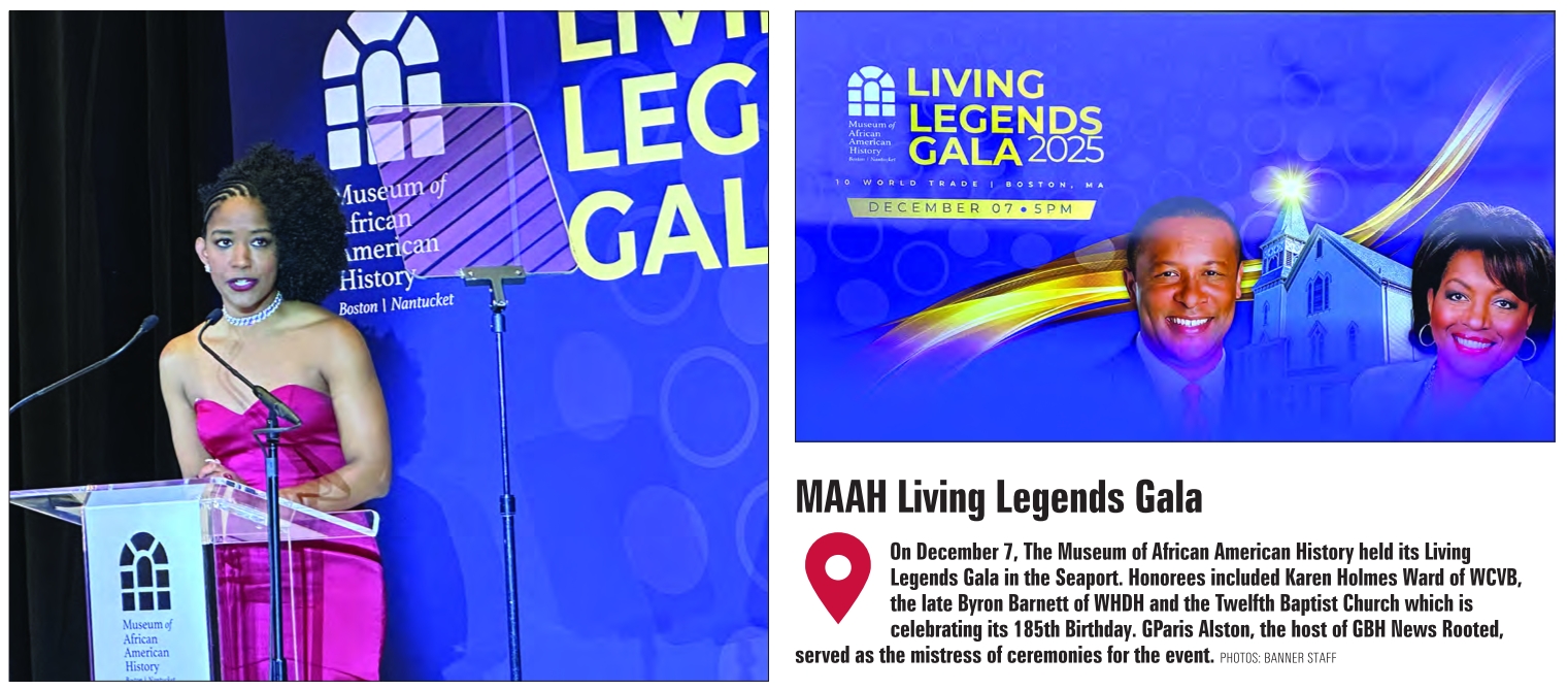 MAAH Living Legends Gala On December 7, The Museum of African American History held its Living Legends Gala in the Seaport. Honorees included Karen Holmes Ward of WCVB, the late Byron Barnett of WHDH and the Twelfth Baptist Church which is celebrating its 185th Birthday. GParis Alston, the host of GBH News Rooted, served as the mistress of ceremonies for the event. PHOTOS: BANNER STAFF