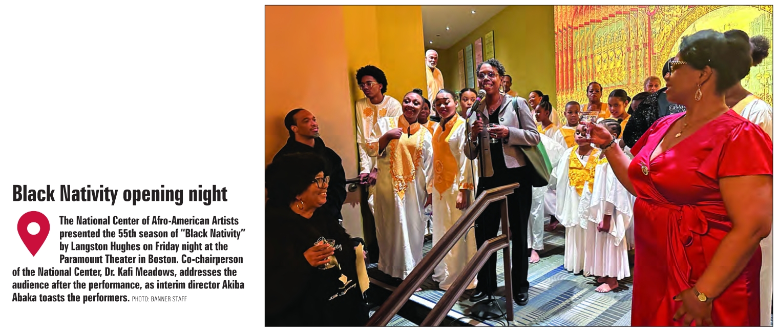 The National Center of Afro-American Artists presented the 55th season of “Black Nativity” by Langston Hughes on Friday night at the Paramount Theater in Boston. Co-chairperson of the National Center, Dr. Kafi Meadows, addresses the audience after the performance, as interim director Akiba Abaka toasts the performers. PHOTO: BANNER STAFF