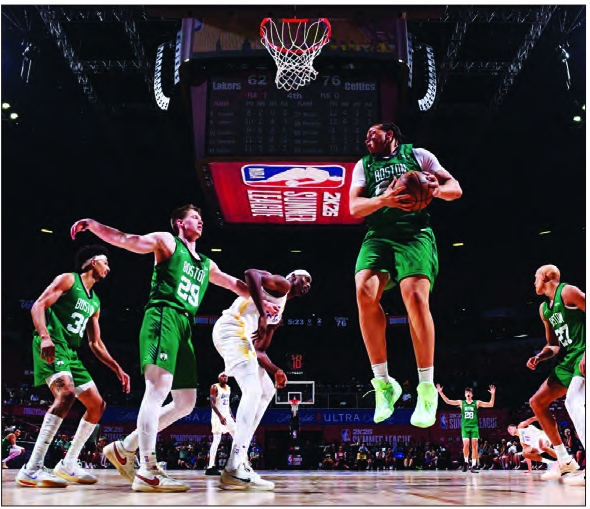 Celtics forward Jordan Walsh goes up for one of his 6 rebounds against the Lakers. The C’s forward also had 17 points.
