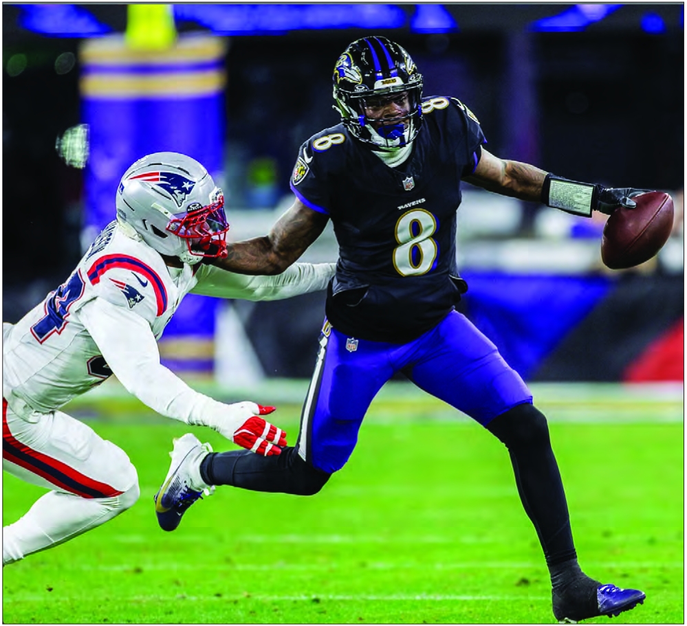 Ravens signal caller Lamar Jackson, runs past the outstretched hands of Patriots LB K’Lavon Chaisson.