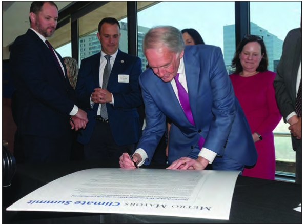 Sen. Ed Markey signs the Greater Boston Metropolitan Mayors Climate Commitment, a 10-year update on a regional agreement between the Metro Mayors Climate Task Force, during the Metro Mayors Climate Summit in May. The commitment, which included priorities around siting clean energy, addressing resilience of vulnerable infrastructure and reducing emissions from transportation and buildings, was one of a number of ways that cities and towns in the Greater Boston area looked to bring climate action across municipal borders.