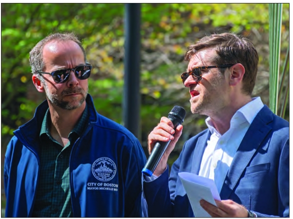 Oliver Sellers-Garcia (right), city of Boston environment commissioner, with Chief Climate Officer Brian Swett at a May press conference announcing city funding for three projects across Boston supporting climate-focused retrofit projects. The dollars came through a fund created as part of a city ordinance aimed at getting to net-zero emissions, and offered an alternative, if smaller, pot of money as federal dollars focused on climate dried up in 2025.