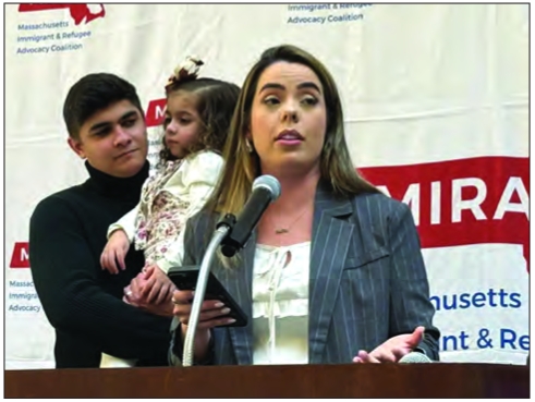 Suyanne Boechat Amaral, with husband Lucas Dos Santos Amaral and daughter behind her, speak about the struggle their family experience when Amaral was detained by ICE.