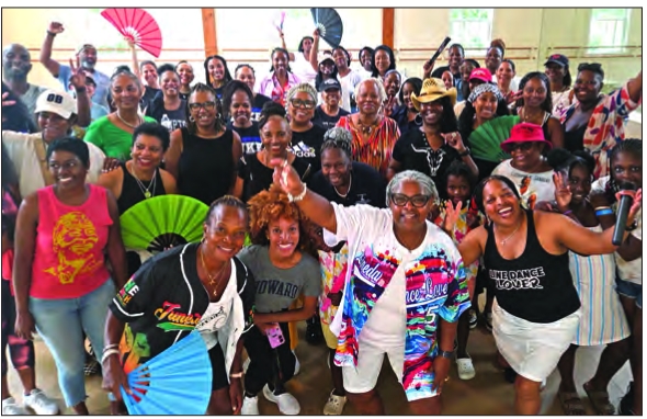 A large group participates in Martha’s Vineyard SoulFest health forum featuring yoga and line dancing addressing topics such as diabetes, cardiovascular health and mental wellness.