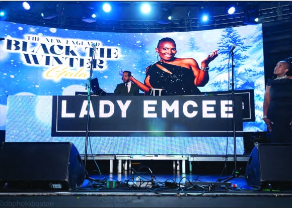 (Far right) Host Lady Emcee looks on at her 10-foot-high poster which adorned the stage at the New England Black Tie Winter Gala.