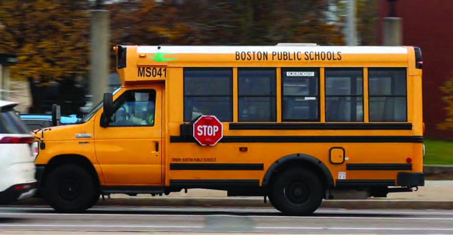 A Boston Public Schools bus travels down Columbus Avenue in Boston, Nov. 26, 2025.