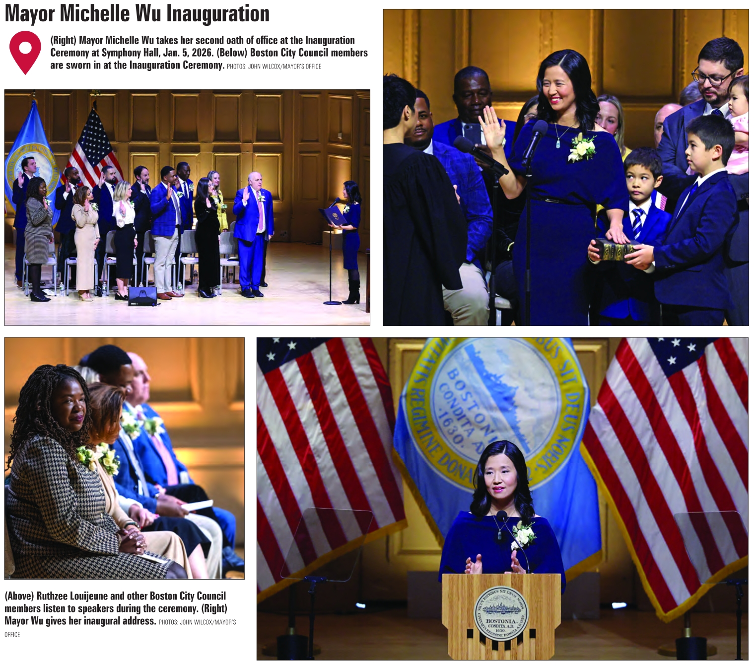 (Right) Mayor Michelle Wu takes her second oath of office at the Inauguration Ceremony at Symphony Hall, Jan. 5, 2026. (Below) Boston City Council members are sworn in at the Inauguration Ceremony. PHOTOS: JOHN WILCOX/MAYOR’S OFFICE