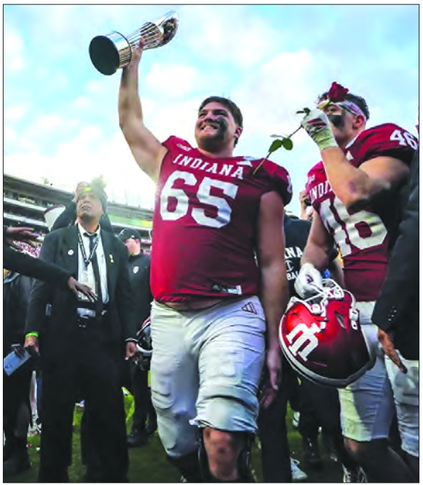 Offensive lineman Carter Smith (65) holds up Indiana’s first-ever Rose Bowl trophy.