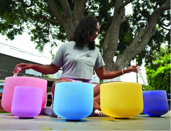 (Above) Gloria and Darren Hagood, founders of HealYourLovePeriod. (Below) Gloria on the sound bowls.