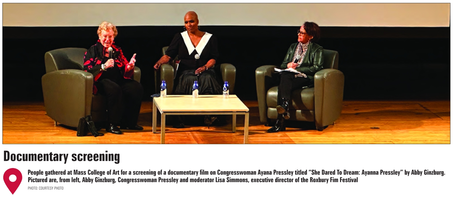 People gathered at Mass College of Art for a screening of a documentary film on Congresswoman Ayana Pressley titled “She Dared To Dream: Ayanna Pressley” by Abby Ginzburg. Pictured are, from left, Abby Ginzburg, Congresswoman Pressley and moderator Lisa Simmons, executive director of the Roxbury Fim Festival