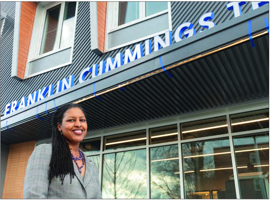 Franklin Cummings Tech President Aisha Francis poses for a photo outside of the school’s new Roxbury campus. The college marked its move to Nubian Square in a ribbon cutting ceremony, Jan. 22.