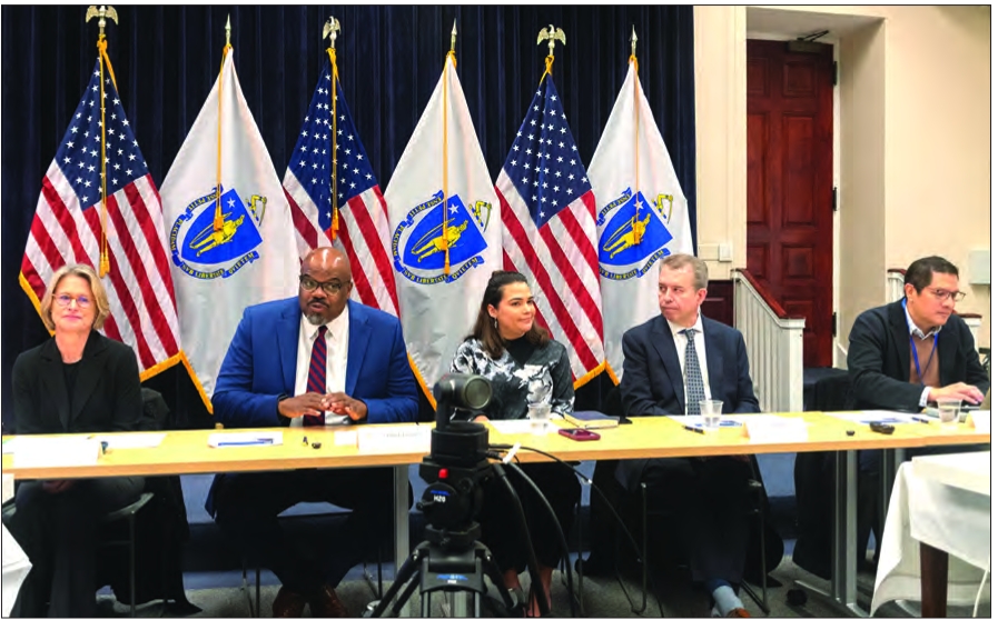 (From left) Massachusetts Commissioner of Early Education and Care Amy Kershaw, Secretary of Education Patrick Tutwiler, Director of Multicultural Media Valentina Amaro, Commissioner of Elementary and Secondary Education Pedro Martinez and Commissioner of Higher Education Noe Ortega at a multicultural media roundtable, Jan. 15. At the event, officials pitched new recommendations for graduation requirements, after voters opted to remove the state’s MCAS standardized testing as a requirement in 2024.