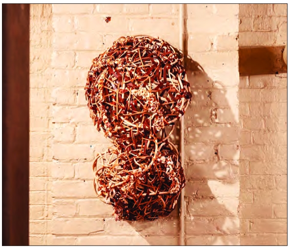 (Clockwise from above) Zainab Sumu, woven sculpture; Venetia Dale, “Thresholds of Care: Wreath 2;” Brooke Stewart, “Game Time, Pink and Blue.”