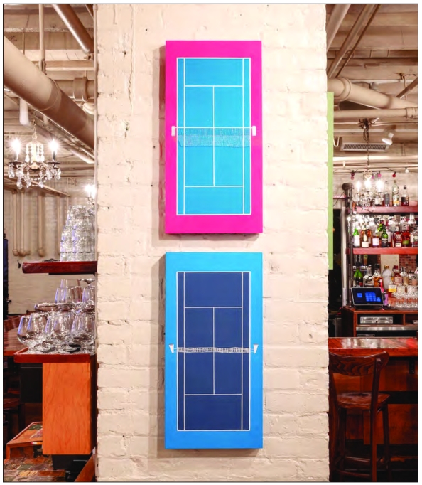In a series of paintings of tennis courts, Brooke Stewart explores the rigid lines that both aesthetically denote the court and allow players to leave everything else behind. On the court there are no to-do lists or emails, it’s just you and the game. No such walls are available for women who are juggling motherhood, creative work and paying the bills, among life’s many other needs.