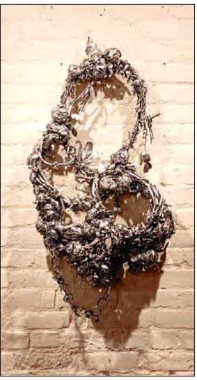 Other artists must steal time to make their work, but by prioritizing artmaking among the other tasks of life, they elevate it to sacred practice. Venetia Dale has a metalwork shop in her basement and a studio in the house where she often works in and around her children’s schedules. For “Ritual Practice | Sacred Space” she made an intricate pewter piece using molds of flowers. Another pewter sculpture is molded on food scraps collected from her children’s meals. Here, life becomes the art.