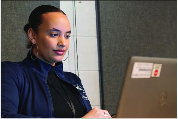 Sonia Amado, director of health access and wellness services at the Boston Public Health Commission, works on her laptop at a health commission walk-in event to connect residents with insurance coverage after the state announced new premium subsidies to replace lapsing federal ones, Jan. 21. The subsidies are part of a broader health care affordability push from the Healey-Driscoll administration.