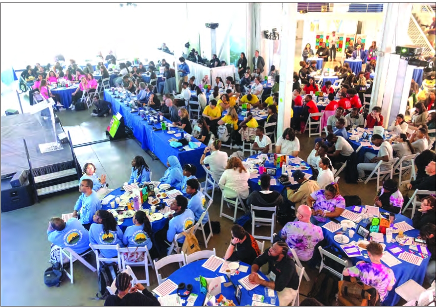 Students gather at the Artists for Humanity building in South Boston for the Aspen Challenge Solutions Showcase, April 29, 2025. The showcase marked the end of a 10-week challenge in which high school students from Boston Public Schools developed and implemented solutions to problems like gun violence, access to green space and youth homelessness.
