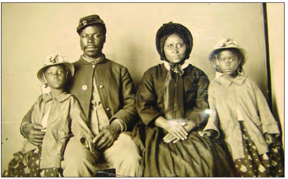 An African American soldier in Union uniform with his wife and daughters