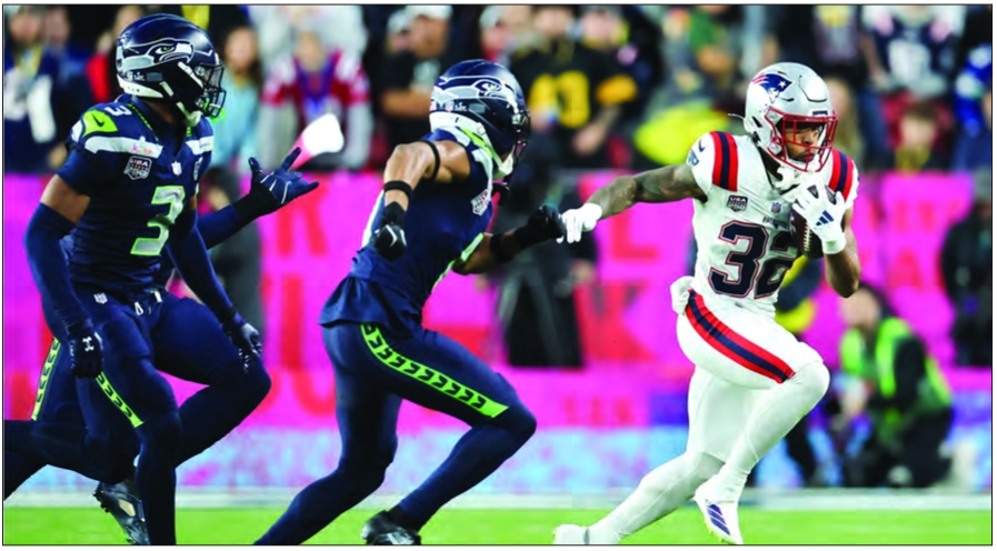 However, the Patriots’ defense, particularly defensive back Christian Gonzalez, kept the Seahawks to three field goals through the first 30 minutes, despite the efforts of Super Bowl MVP Kenneth Walker III. Walker rushed for 94 of his game-high 135 yards (27 carries) before halftime. He became the first running back since Terrell Davis (157 yards in 1998 for the XXXII Super Bowl champion Denver Broncos) to win the Super Bowl Most Valuable Player Award.