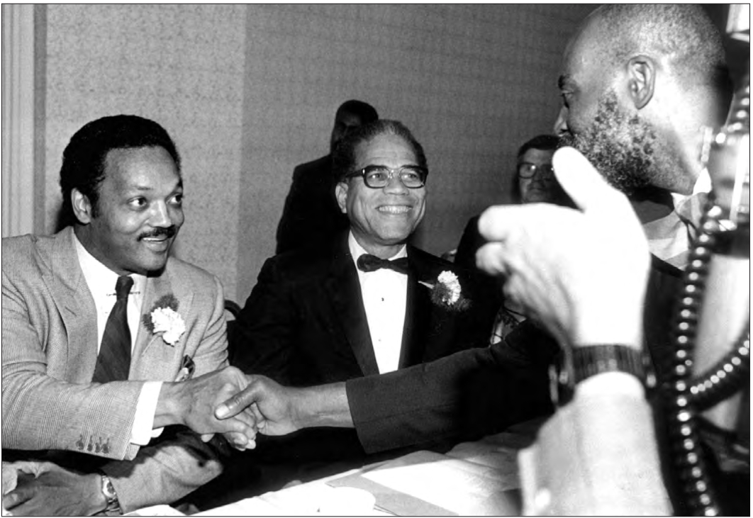 Jesse Jackson, keynote speaker at 1987 ABCD Community Awards Dinner, shakes hands with community leader Mel King as ABCD president/CEO Robert M. Coard looks on. Jackson came to Boston at the height of his presidential campaign to address a sold-out crowd at the annual Action for Boston Community Development event honoring community activists and to meet with business and political leaders.