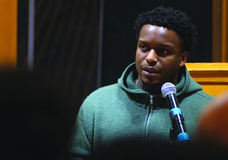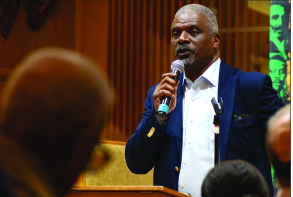 Jeffrey Brown, co-founder of My City at Peace, addresses community members at a listening session about the canceled Parcel 3 development project, Feb. 9.