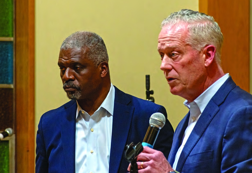 Jeffrey Brown (left), co-founder of My City at Peace, and HYM Investment Group CEO Tom O’Brien take questions at the community listening session.