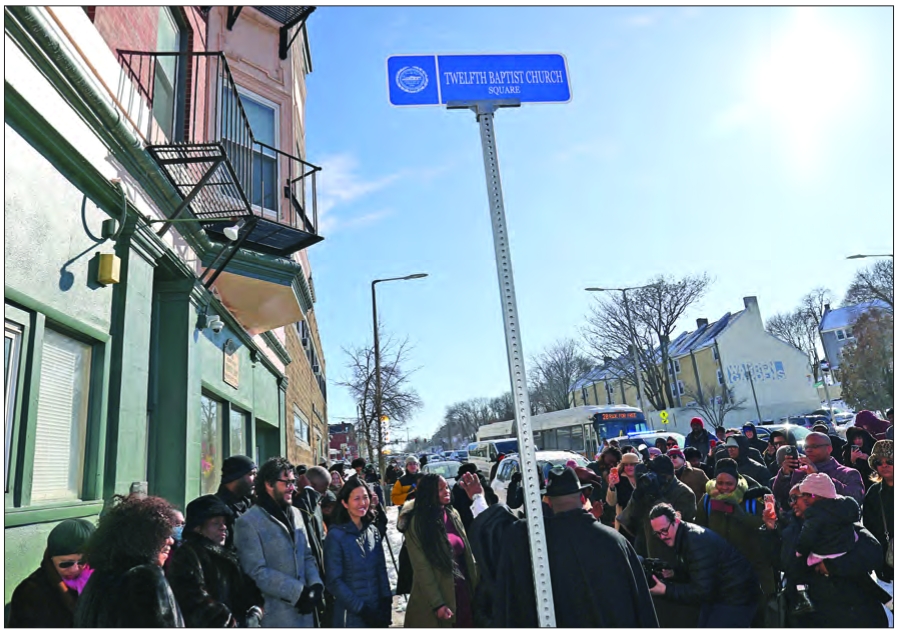 Mayor Michelle Wu, local leaders and community members gather at the unveiling of the Twelfth Baptist Church street sign.