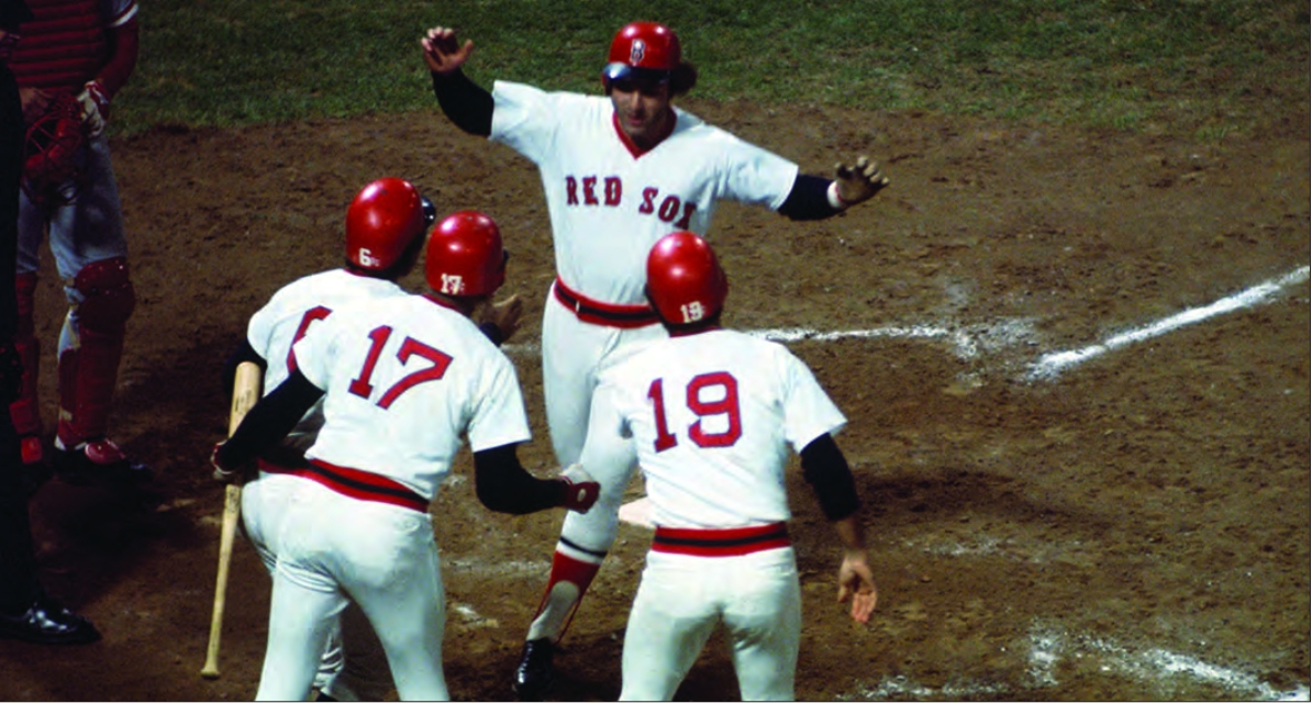 Bernie Carbo crossing home after World Series HR against the Reds in 1975. Carbo’s toy gorilla became a statement of the troubled times in Boston.