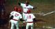Jesse Jackson, keynote speaker at 1987 ABCD Community Awards Dinner, shakes hands with community leader Mel King as ABCD president/CEO Robert M. Coard looks on.