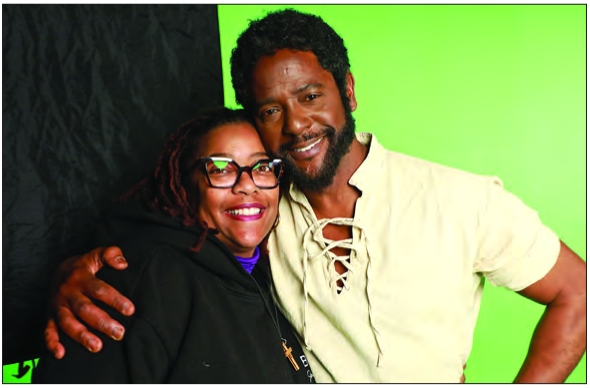 (Above) Actor Blair Underwood with Echoes of Liberty production crew after shooting scenes at Anawan Studios in Brockton. (Below) Nerissa Williams, Echoes of Liberty executive producer, and Underwood, in character as the American Revolutionary War hero Crispus Attucks.