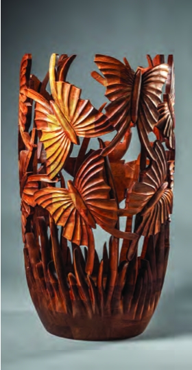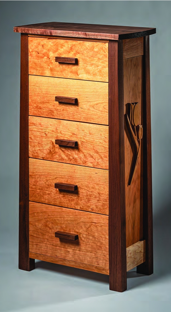 (Above) Jeff C., Tulip Chest of Drawers, 2025, walnut and cherry. (Left) Charlie J., Butterfly Vase, 2023, Mahogany.