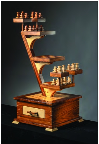 Mike H., 3-D Chess set, 2025, walnut, maple, and mahogany.