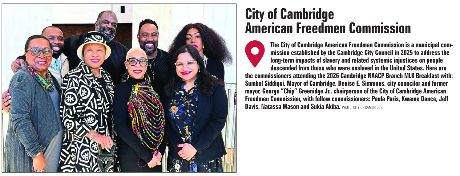 The City of Cambridge American Freedmen Commission is a municipal commission established by the Cambridge City Council in 2025 to address the long-term impacts of slavery and related systemic injustices on people descended from those who were enslaved in the United States. Here are the commissioners attending the 2026 Cambridge NAACP Branch MLK Breakfast with: Sumbul Siddiqui, Mayor of Cambridge, Denise E. Simmons, city councilor and former mayor, George ”Chip” Greenidge Jr., chairperson of the City of Cambridge American Freedmen Commission, with fellow commissioners: Paula Paris, Kwame Dance, Jeff Davis, Natassa Mason and Sukia Akiba. PHOTO: CITY OF CAMBRIDGE