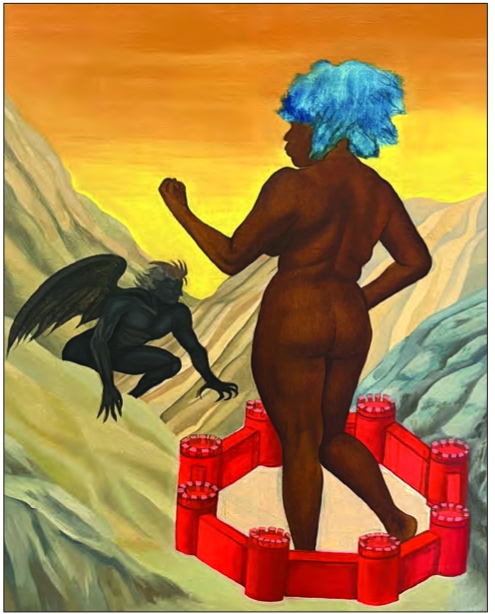 In “Confrontation on the Mountaintop,” the woman is surrounded by a red fortress in the valley of the mountains confronting a black, winged demon.