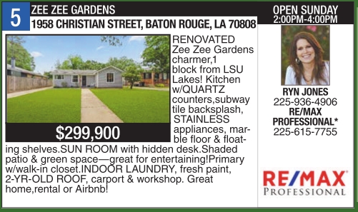 OPEN SUNDAY 2:00PM-4:00PM RYN JONES 225-936-4906