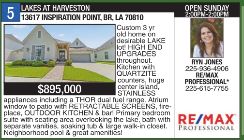 13617 INSPIRATION POINT, BR, LA 70810 $895,000 Custom 3 yr old home on desirable LAKE lot! HIGH END UPGRADES throughout. Kitchen with QUARTZITE counters, huge center island, STAINLESS appliances including a THOR dual fuel range. Atrium window to patio with RETRACTABLE SCREENS, fireplace, OUTDOOR KITCHEN & bar! Primary bedroom suite with seating area overlooking the lake, bath with separate vanities, soaking tub & large walk-in closet. Neighborhood pool & great amenities!