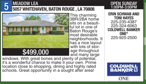 OPEN SUNDAY 1:00PM-3:00PM ERIN SCHWAB AND TONI HAYES 225-235-4387 225-324-6063