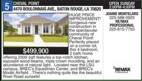 OPEN SUNDAY 2:00PM-4:00PM JOANIEMONTELARO 225-588-5925 RE/MAX PROFESSIONAL 225-615-7755 See also